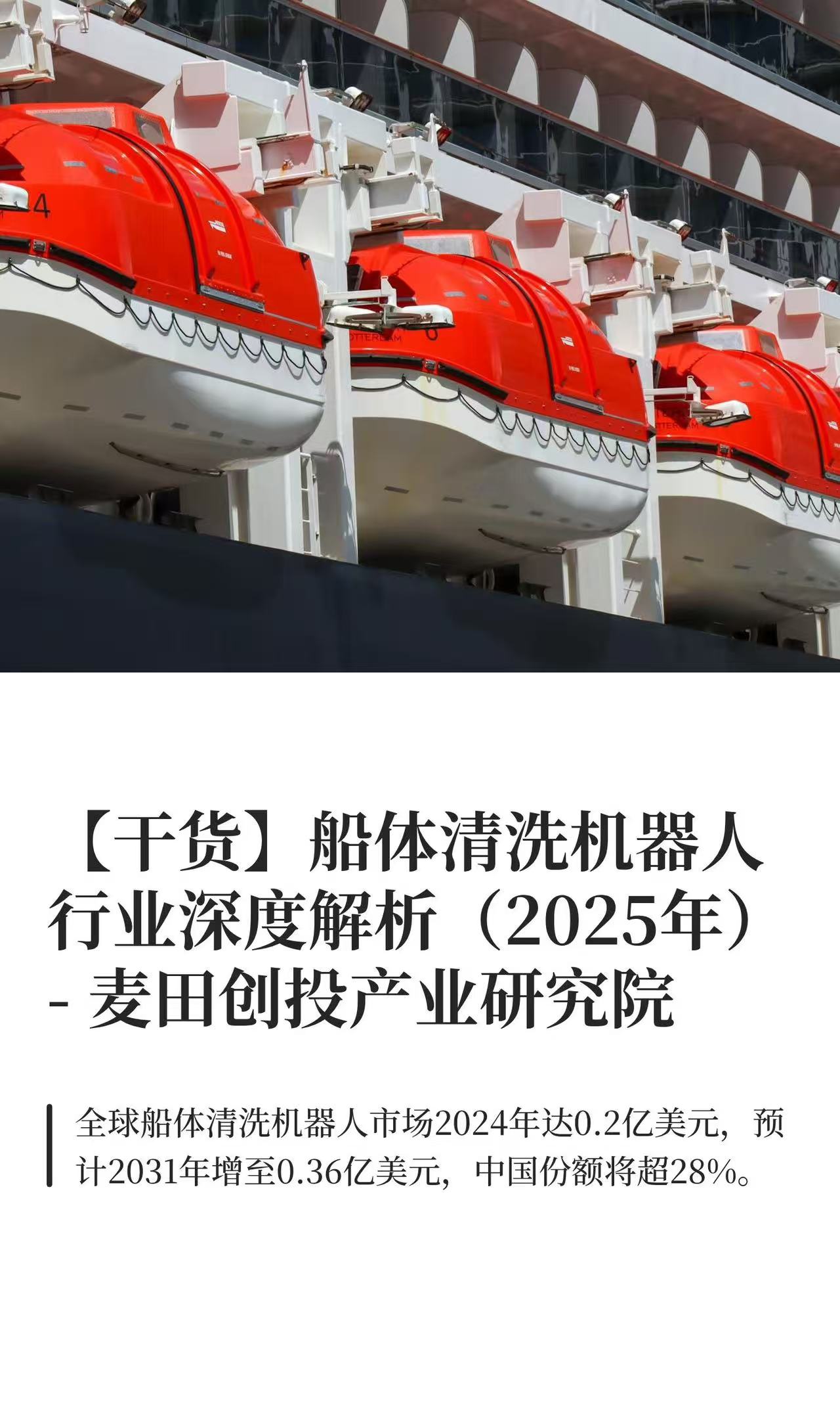 更多本行业研究分析详见麦田创投产业研究院发布的《2025-2031年全球与中国船体清洗机器人市场现状研究分析与发展前景行业-机遇,挑战,风险,和最新趋势分析》